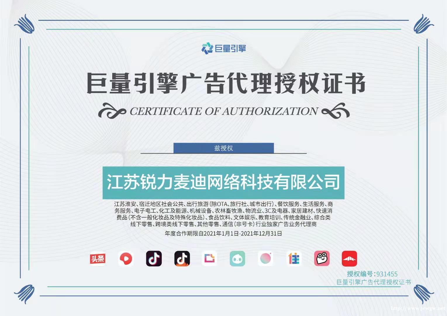 江苏锐力麦迪网络科技有限公司是今日头条产品系在淮安、宿迁地区的独家授权代理服务商,负责运营今日头条、抖音、西瓜视频、火山小视频、懂车帝、穿山甲等客户端的网络平台领域内的互联网广告销售业务。